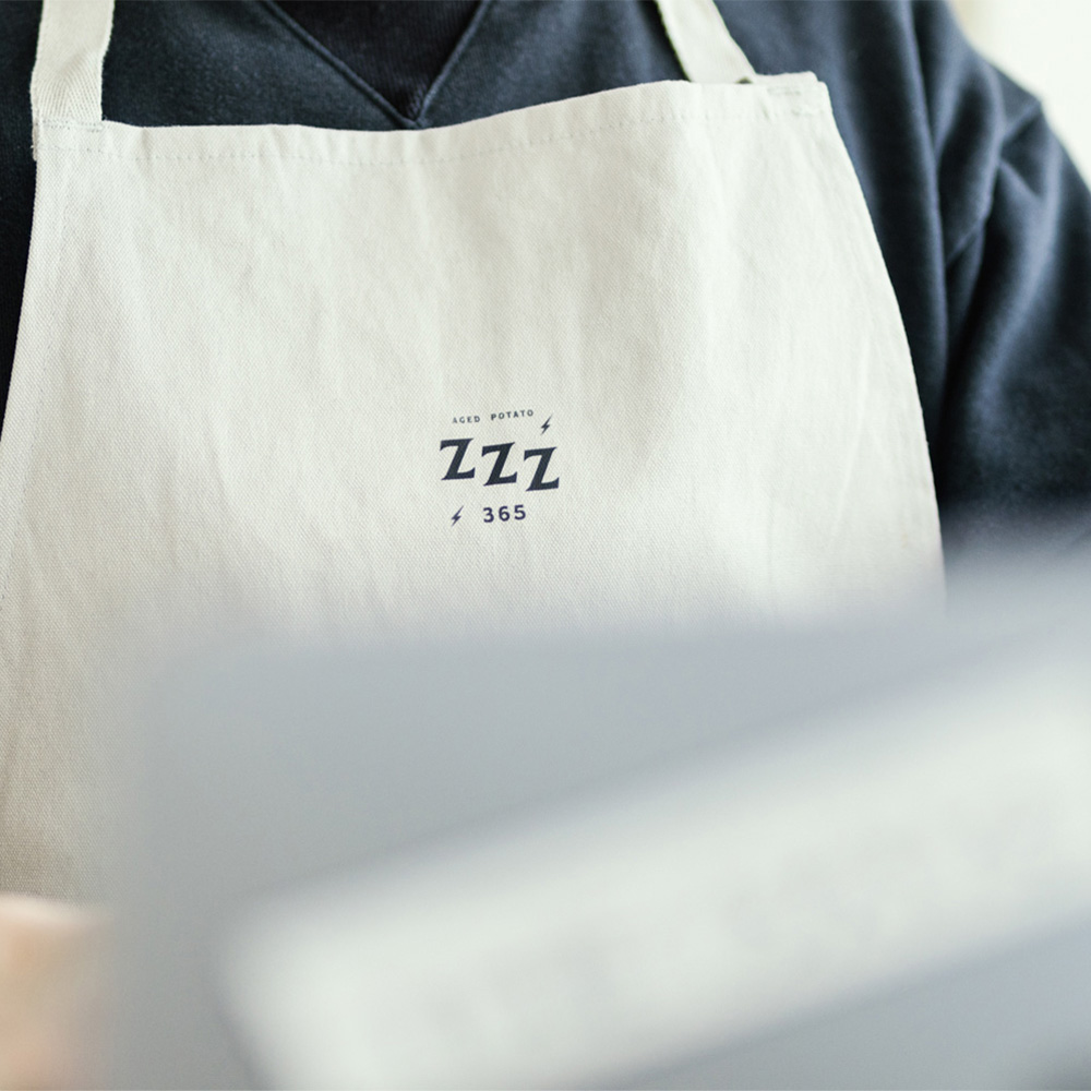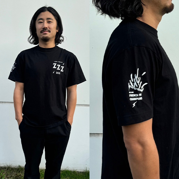 2024年、日本フライドポテト協会が主催する日本一決定戦で見事に優勝したZZZ365を記念して、オフィシャルTシャツが登場しました。特別限定デザインで、ZZZ365の象徴である特別な「日本一のフライドポテト」をイメージしたオリジナルロゴが右腕にプリントされています。